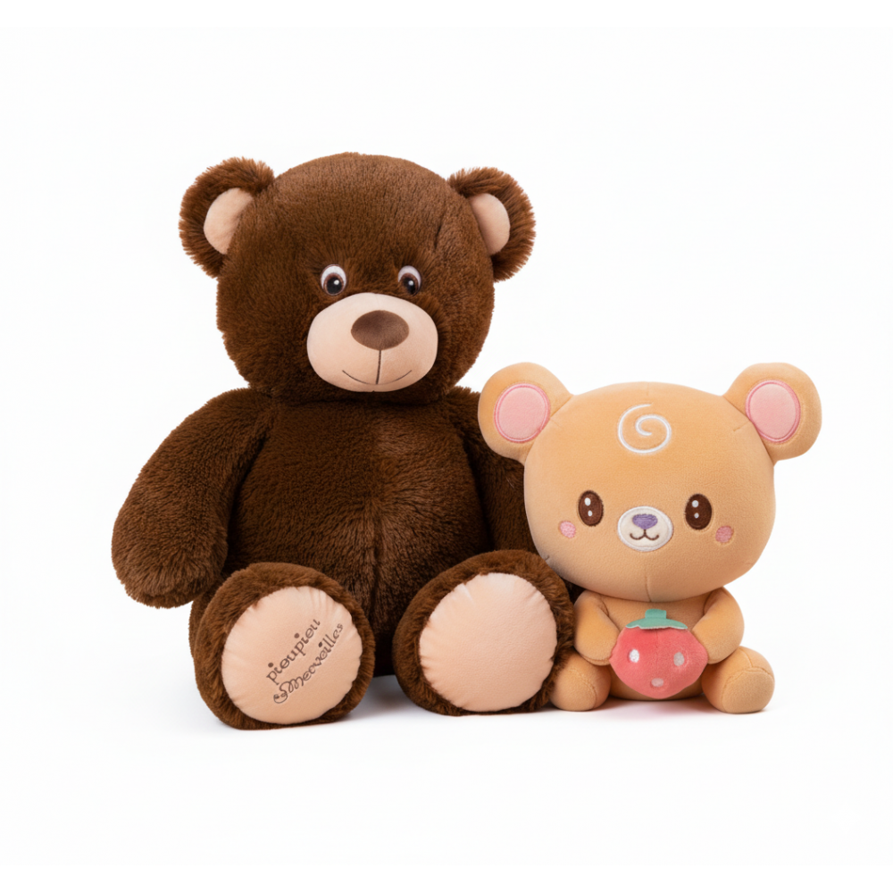 • Craquez pour notre duo exclusif Saint-Valentin, une rencontre entre tendresse XXL et douceur gourmande. Augustin, l’ourson géant de 70 cm fabriqué en France, rassure et enveloppe de câlins grâce à son pelage ultra-moelleux et son allure réconfortante. À ses côtés, Cinnybun, l’ourson caramel de la collection Cushablez, séduit avec ses détails sucrés et son style adorable qui apporte une touche de fantaisie à chaque instant.