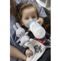 Miffy la célèbre Lapine se décline ici en doudou. Son doux pelage et sa jolie couleur bleue en feront la compagne idéale à câliner et suivra bébé partout.