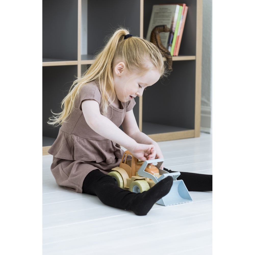 Un tracteur écologique en bioplastique de 30 cm, robuste et fonctionnel, idéal pour transporter sable et jouets dès 2 ans.