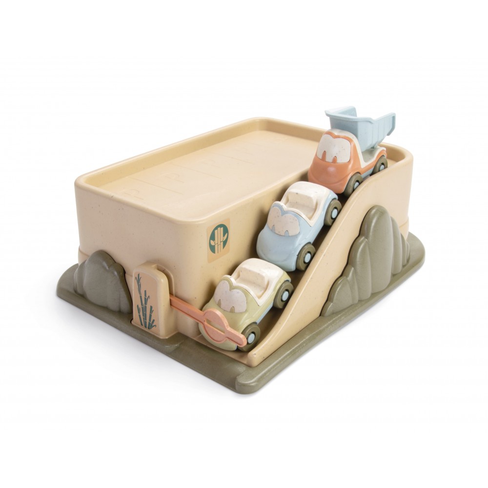 Un garage écologique en bioplastique avec 3 petites voitures colorées, idéal pour inventer des histoires de circulation et de stationnement dès 12 mois.