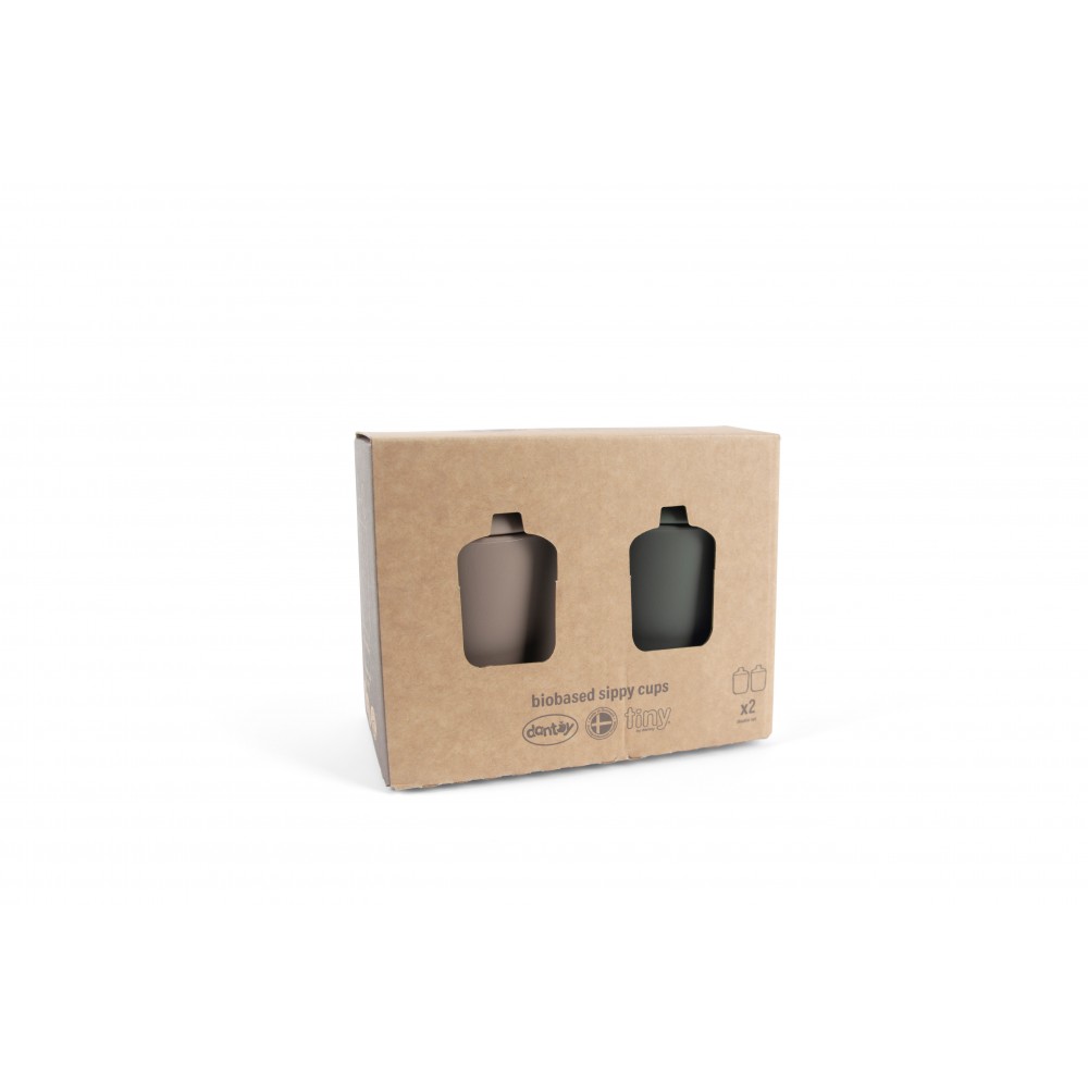 Un set de 2 gobelets avec couvercle en bioplastique taupe et vert, pratiques et sûrs pour accompagner les premiers repas et boissons des enfants dès la naissance.