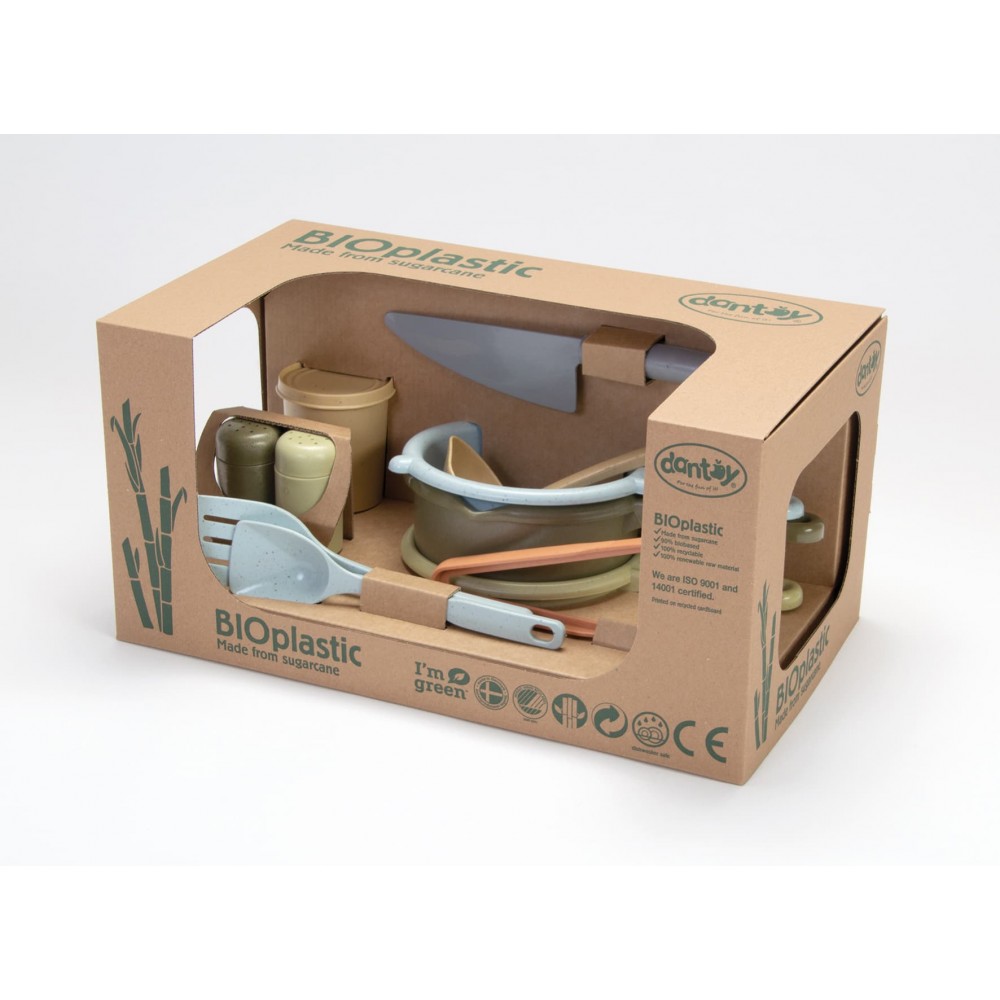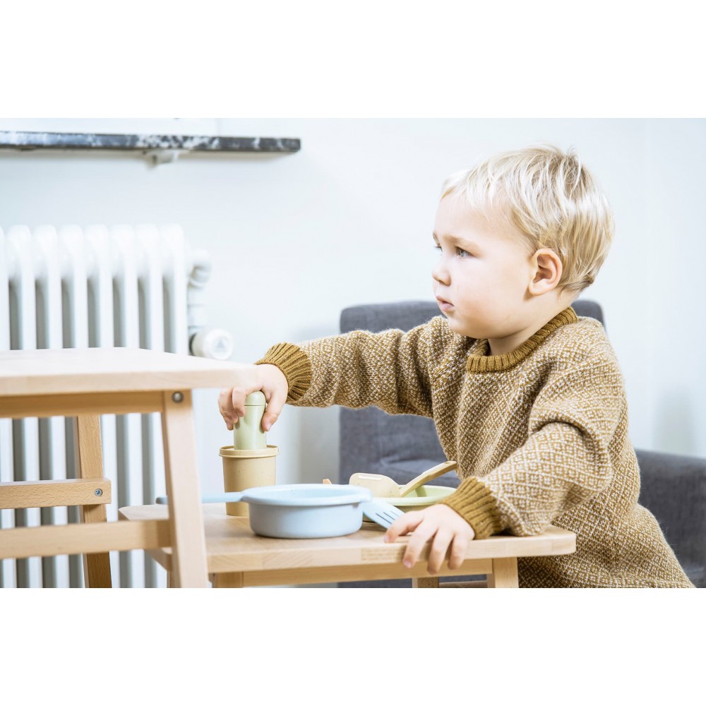 Un set de cuisine de 11 pièces en bioplastique, durable et écologique, pour initier les enfants au jeu d’imitation et aux plaisirs de la cuisine dès 2 ans.